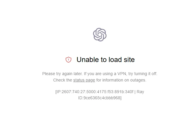 Пытаюсь зайти в ChatGPT с компьютера, но вместо страницы постоянно вылезает “Unable to load site”. Интернет вроде нормальный - другие сайты открываются без проблем, а тут вообще не грузит. Не могу понять, это что-то у меня в браузере или сети сломалось или с самим сервисом что-то происходит.
