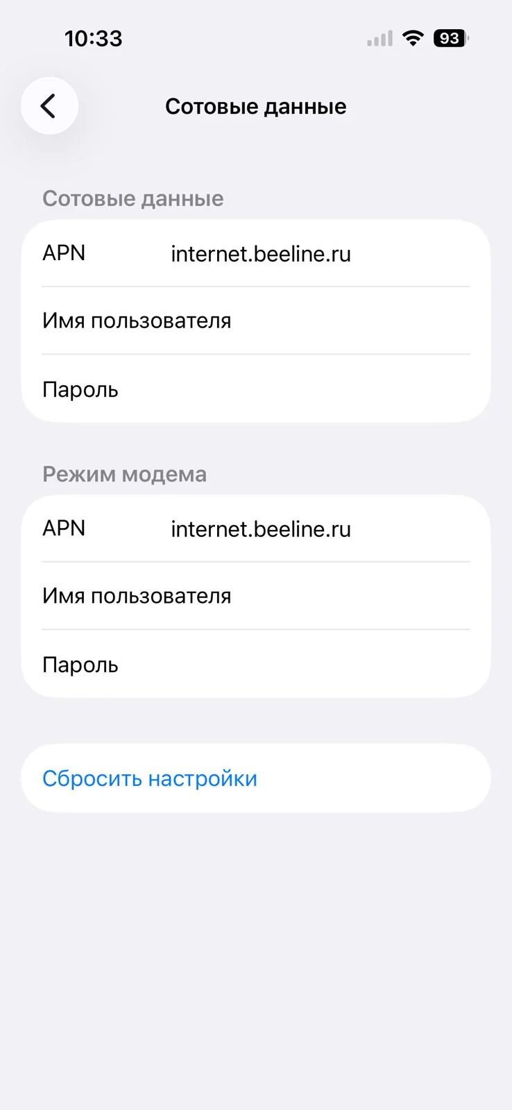 В разделе «Сотовые данные» введите параметры вашего оператора (пример для Билайна: APN - internet.beeline.ru, имя и пароль - beeline или можете оставить пустым).