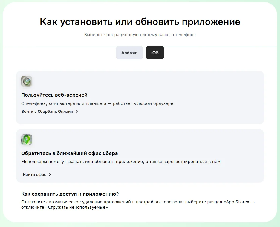 Я бы не тратил время на поиски, в App Store приложение Сбера сейчас не найдёшь. На их официальном сайте написано, что можно спокойно пользоваться веб-версией через браузер, а если нужен именно вариант с приложением, то лучше зайти в ближайший офис - там помогут всё установить и зарегистрироваться. Лично мне кажется, в таких вещах безопаснее идти только через официальный сайт или офис, а не через какие-то сторонние способы.